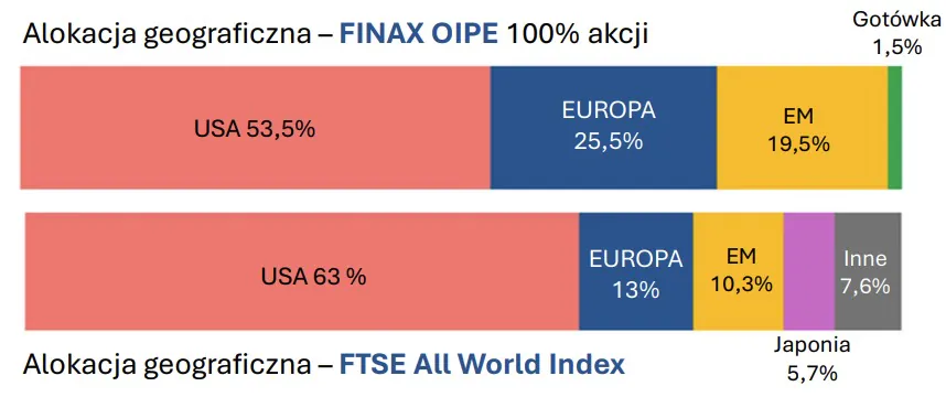 Na grafice widzicie jak wygląda np. ekspozycja geograficzna indeksu FTSE All World w porównaniu ze składem ETF-ów dobranych przez Finax (listopad 2025). Widać wyraźnie, że w Finaxie mamy kilka istotnych odchyleń: