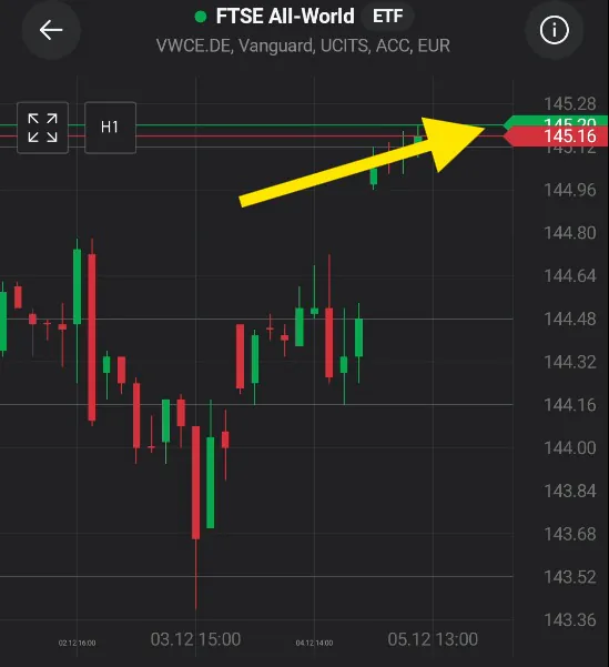Na zielono aktualny poziom ceny po jakiej mogę kupować, czyli cena ASK w tej chwili 145.20 EUR, oraz na czerwono cena BID po jakiej na rynku można sprzedawać, 145,16 EUR.