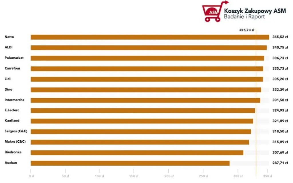 Dzięki uprzejmości Pana Kamila z ASM SFA, który udostępnił mi te dane z badania Koszyk Zakupowy ASM, możesz zobaczyć teraz na ekranie, jak wyglądała różnica w cenach przykładowego koszyka zakupowego w listopadzie 2025. Zobacz ten rozstrzał cen pomiędzy najdroższym i najtańszym sklepem – to ponad 50 zł!