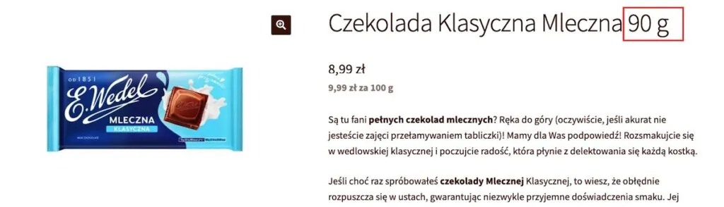 Dlatego zawsze patrz na cenę za kilogram (albo litr), bo tylko ona mówi prawdę o tym, ile realnie płacisz. Jeśli wprowadzisz taki nawyk zakupowy, od razu połapiesz się, gdy producent zmienia gramaturę produktu, żeby ukryć wzrost ceny. Jakiś czas temu takie niefajne zagranie zastosowali producenci czekolad. Być może pamiętasz te piękne czasy, gdy standardowa tabliczka czekolady miała 100 g. Od kilku lat wielu producentów niepostrzeżenie zmniejszyło gramatury czekolad do 90 g. Poniżej przykład Wedla: