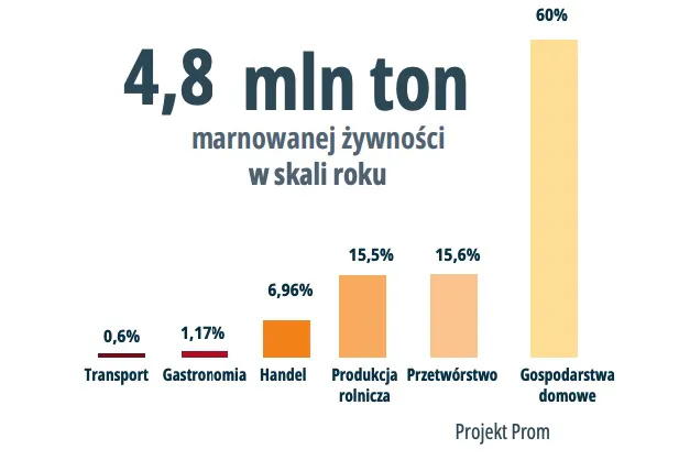 - 4,8 mln × 60% (czyli tyle, ile marnują gospodarstwa domowe), daje nam 2,88 mln ton/rok, czyli 2,88 mld kg/rok